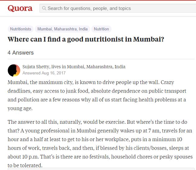 She is attached as a visiting Consultant Dietician to hospitals in Chembur and Ghatkopar in Mumbai.